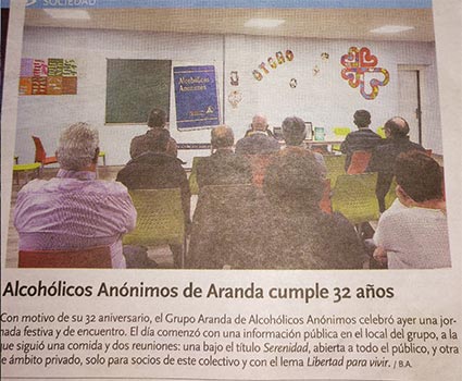 Hacia el mes de Noviembre solemos celebrar el aniversario del grupo con una información pública para todo aquel que quiera ir, después comemos y luego una reunión abierta junto con Al-Anón (familiares y amigos de alcohólicos) y por último una reunión cerrada.