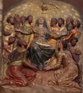 Como hemos venido diciendo, los relieves tienen como eje principal, el símbolo del Espíritu Santo a quien estaba dedicado el convento y naturalmente el retablo, las cuatro escenas nos remiten a otros tantos episodios de los evangelios en los que la figura de la paloma, como representación del Espíritu Santo, tiene una presencia notoria, "la Anunciación", "el bautismo de Cristo", "la venida del Espíritu Santo o Pentecostés", (que era la tabla central del retablo).