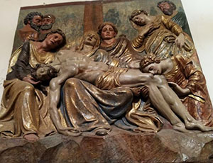 Y "Jesucristo difunto o el descendimiento" en este último vemos que es la única tabla en la que no figura el Espíritu Santo, ello es debido a que la parte superior del relieve estaba totalmente perdida antes de su restauración por lo cual se desconoce si estaba o no incluida la paloma en él.