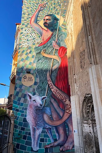 Como aportación de mayor impacto desde la vía pública está el mural que ha hecho el artista arandino Nano Lázaro y que está dedicado al titular de la parroquia, San Juan Bautista, cuya imagen se puede ver en esta página. La iconografía es la habitual para identificar al Precursor: túnica basta de piel de animal, una vara con la inscripción de las palabras de los evangelios “Agnus Dei” (cordero de Dios), la capa roja que nos recuerda su condición de mártir y a sus pies el cordero. Nano ha querido dar al fondo una estética propia de mosaico para conectar el mural con la fachada antigua. Puede llamar la atención el santo al que está acogido esta iglesia porque hay otra en Aranda que tiene idéntica advocación. El motivo es que cuando en abril de 1966 se cierra al culto la centenaria parroquia de San Juan Bautista se decide darla continuidad en la antigua capilla del Colegio de la Vera Cruz. Tanto los archivos parroquiales como los sacerdotes pasan a la nueva iglesia. Desde 2004 la iglesia de San Juan es Museo de Arte Sacro. Inicialmente se hablaba que la parroquia seguía llamándose “San Juan Bautista” y como tal figuraba en toda la documentación. Con los años, y dado que eran muchos los arandinos que seguían conociendo esta iglesia, como “la de la Vera Cruz”, se acabó denominándola “San Juan de la Vera Cruz”.