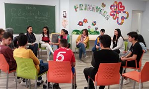 De lunes a jueves y en horario de 16h a 19:30h realiza actividades de Apoyo Escolar, Ocio y Acompañamiento Personal y Familiar a un grupo de unos 40 chavales.