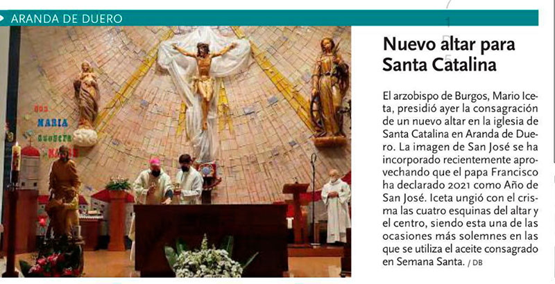 El pasado día 25 de abril en la misa de 12:30 horas, el arzobispo de Burgos, D. Mario Iceta consagró el nuevo altar de nuestra iglesia donde se celebra la Eucaristía ungiendo con el crisma las cuatro esquinas del altar y el centro, siendo ésta una de las ocasiones más solemnes en las que se utiliza el aceite consagrado en Semana Santa.