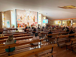 Este año 2021 como templo parroquial cumple sus bodas de oro, hemos querido renovar todo el mobiliario del presbiterio, haciendo un nuevo altar, un ambón, un atril, una sede, una credencia y un pie de cirio pascual. Todo ello hecho de madera de cedro y expresado con diversos colores queriendo representar la multiculturalidad de este barrio que queda patente en cada uno de esos muebles pero especialmente en esos dos símbolos tan significativos como son el ambón donde se proclama la palabra de Dios y el altar donde se celebra la Eucaristía.