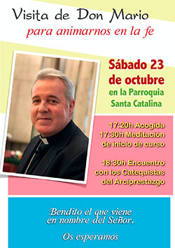 El próximo sábado día 23 de octubre por la tarde tendremos la visita del Obispo D. Mario en nuestra parroquia, que nos dará una meditación como comienzo del curso.