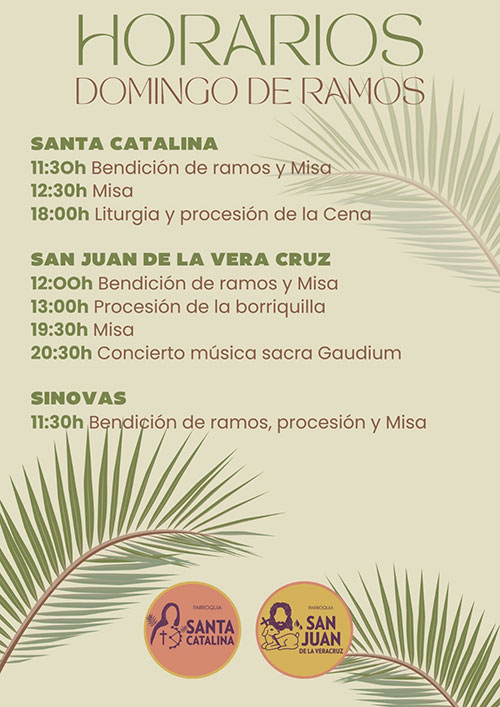 Aquí os dejamos los horarios de los actos para el domingo de Ramos de las tres parroquias, Santa Catalina, San Juan de la Vera Cruz y Sinovas.