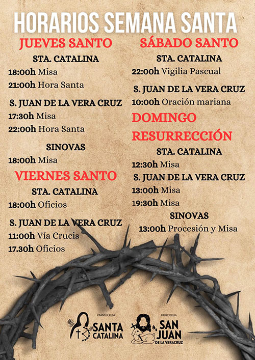 Aquí tenéis el horario para estos días de Semana Santa de las tres parroquias, Santa Catalina, San Juan de la Vera Cruz y Sinovas.