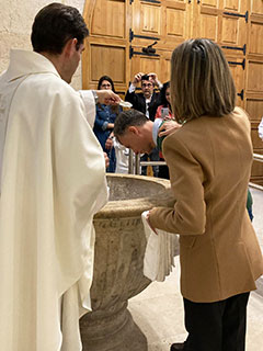 Álex, un adulto que ha ido preparándose durante dos años y conociendo la fe católica, recibió el sacramento del Bautismo, de la Comunión y de la Confirmación en una celebración llena de signos y muy bella.